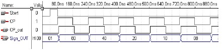 由图4 可知,当CPLD1#接收到‘Start’命令后,在‘CP’触发信号的作用下,Sign_out 端口依次输出(00001000)B、(00010000)B、(00100000)B 等信号,实现了将‘1’进行移位且并行输出。