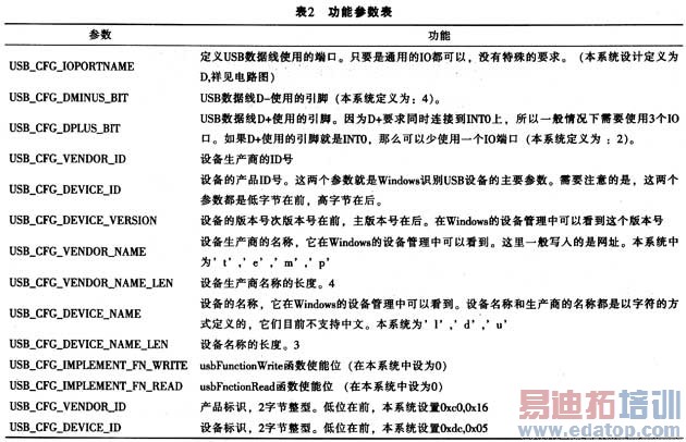 该设计只要对usbconfig.h的内容进行配置,便可减小代码量。其主要参数配置如表2所列。