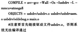 为了利用ATMEGA8模拟"软USB",应在WINAVR将AVRUSB的文件配置文件夹USBDRV放置在源文件目录下,在该目录下,编程中所需要的文件如表1所列。