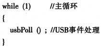 用户程序的主循环中需要定期调用USB事件处理函数usbPoll ()。USB事件处理函数usbPoll ()在没有USB事件需要处理时将直接返回,否则将调用内部函数来进行相应的事件处理,最后再将数据传递到用户接口函数中。通常的方法是: