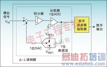 图1:Δ-Σ ADC由执行模数转换的Δ-Σ调制器及其后的数字滤波器和抽取器组成。