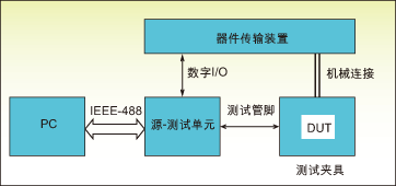 ![]() 图1:二极管测试时的测量设备设置。 这个问题的解决办法是使用GPIB对仪器进行预配置,然后让仪器自己执行测试。许多现代仪器拥有源存储器列表(source memory list)编程功能,允许设立和运行多达100个完整的测试序列而无须PC干预。每个测试可包含不同的仪器配置和测试条件,可包括源的配置、测量、条件跳转、数学功能和通过/失败极限测试和存储功能。某些单元可在直流或脉冲模式下,采用不同的参数和时间安排运行,使得有可能减慢较敏感的测试,或加速其它测试以优化整个测试时间进程。 当仪器基本上自主运行时,GPIB的角色就是测试前下载测试程序以及测试后上传结果到PC,两者都不干涉实际测试。 仪器触发 为实现简单的电流-电压扫描(I-V),SMU输出一系列电压同时测量对应的电流。在每个电压级,SMU首先提供一个电压。电路中的电压变化将引起一个瞬态电流,因此对测试完整性而言在激励和测量之间设定一个合适的延时很关键。在不同的范围内仪器将自动调节延时来产生最佳结果。然而,给测试电路附加额外的部件,例如长电缆、开关矩阵等,这将改变电路的瞬态特性。对于高阻器件,较长的测试时间通常是必要的。在这些情况下,用户需要定义额外的延时以维持测量的完整性。 二极管的测试 我们的第一个例子包括测试仪器、器件传递装置(handler)和PC(图1),这里需要注意如何通过内部编程来消除大多数的GPIB通讯来加速测试。 二极管的生产测试包括验证步骤确定待测二极管的极性,然后测试正向压降、反向击穿电压以及漏电流。 正向压降是指在某些规定的正向电流时二极管两端的电压,通过在二极管上通过规定电流,然后在其两端测量电压来得到。反向击穿电压(VRM或VBR)是电流突然无限增加时的反向电压,这通过施加反向电流并测量二极管两端的电压来测量。读出的电压与特定的最低极限相比较以决定测试通过或失败。漏电流IR有时也称为反向饱和电流,IS是给二极管施加小于反向击穿电压的一个电压时的电流,它是通过施加一个特定的反向电压并测量产生的电流来得到的。编写程序来在源/存储器仪器的存储器位置(memory location)中设置二极管的测试,然后通过IEEE总线传来的一个触发开始执行,仪器按照存储器中的设定编程位置执行操作,无须计算机的干预。