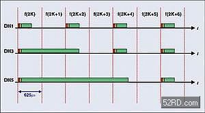 图3显示了7个连续时间间隔使用DH1、DH2和DH5包的包时序协议,由于发射和接收包长度都相同,所以DH1有一个对称链接,收发器在偶数时间间隔发射数据而在奇数时间间隔接收数据。DH3使用3个时间间隔,DH5用5个,DH3和DH5包的有效载荷比较长,由于协议的开销是固定的(存取编码+报头),所以可提供更高数据流量。