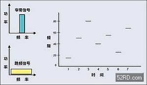 (图2)用原始数据对载波进行调制并使用与每个链路端点跳频代码一致的频率范围发射时使用FHSS系统
