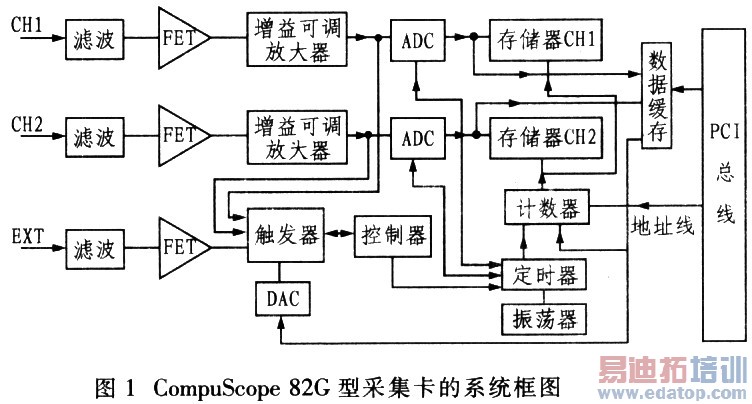 本虚拟示波器采用Gage公司的CompuScope82G型高速数据采集卡作为PCI接口。采集卡的硬件结构如图1所示。
