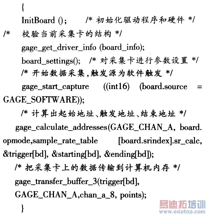 信号采集模块主要完成数据的采集,根据采集信号的不同选用不同的采样频率。该模块中的应用程序通过采集卡的驱动程序和硬件进行通信,如果把该模块放在程序主线程中实现,那么,当应用程序与驱动程序进行数据通信时主界面就会冻结。为了解决这个问题,本文直接创建一种子线程来单独完成与驱动程序的通信任务,让主界面专用于响应视窗界面的信息。在子线程中通过调用gage_start_capture()函数进行数据的采集。图2示出数据采集流程。数据采集的主要代码如下: