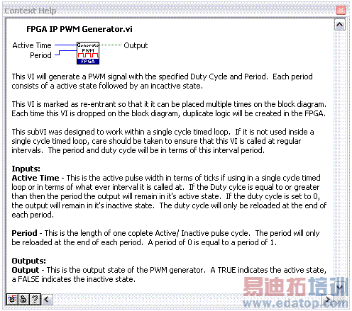 例如对于一个PWM输出IP模块,应用开发人员将为PWM输出信号选用某条数字输出线。在此例中,该PWM IP模块应当产生并输出信号的当前状态。开发人员将把在更高层次VI中赋值给I/O资源。该I/O资源未嵌入在IP代码模块的框图中。