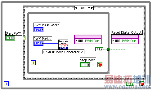 图1:一个调用PWM输出IP代码模块(子VI)的应用VI的框图