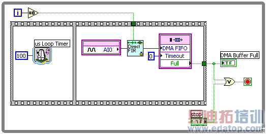 图2:使用一个模拟滤波器IP子VI(直接FIR)。模拟数值在主VI采集并传递给滤波器IP。