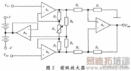 在此采用仪用放大器组成高共模抑制比测量放大器如图2所示,运放A4实现输出共模电压反馈至电源公共端,使运放电源电压随共模输入电压浮动,从而使各级偏置电压都跟踪共模输入电压,这样各级的共模信号就被大大削弱了,共模输入电压在放大器输出端产生的误差电压就大幅度减少,提高了放大器的共模抑制比。图中Rw由3条并列的固定电阻通路构成,3条电阻通路由单片机控制的3个继电器来分别接通实现。很容易分析得到此放大器的放大倍数为: