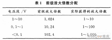 由此,改变Rw获得3个控制等级的前级电压放大倍数,分别对1~10 V,0.1~1 V以及小于O.1 V的3个不同电压段的信号进行控制,通过继电器切换的方式实现不同的放大倍数,如表1所示。