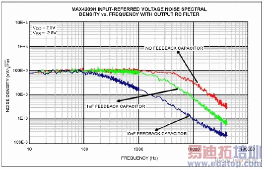 图7. 外接RC 输出滤波器和不同反馈电容情况下,MAX4209H 的输入参考噪声密度曲线