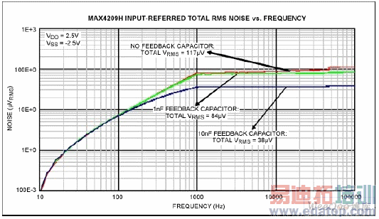 图6. 无反馈电容、电容等于1nF 和10nF 时,MAX4209H 输入参考噪声的RMS 值