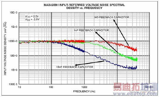 图5. 无反馈电容、电容等于1nF 和10nF 时,MAX4209H 输入参考噪声密度曲线