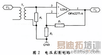 本系统采集三相电压、三相电流以及中性线的两路电压和电流信号。电压和电流的采样电路类似,电压采用电压互感器,电流采用电流互感器,通过运放OPA2277组成电压和电流采样电路。电压采集电路如图2所示。图2中,T1为电压互感器。电压互感器出来的信号通过OPA2277处理后送入数据选择器AD7502的S1输入引脚。其他7路电压和电流信号分别送入AD7502的另外7个输入引脚。