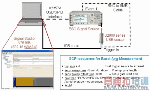 图 4:使用 ESG 信号发生器和 U2001A USB 功率传感器的猝发脉冲平均功率测量设置