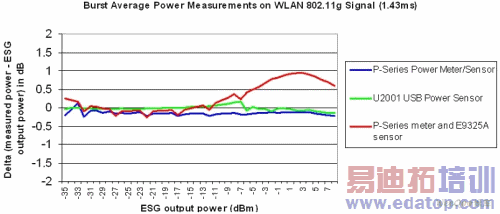 P系列 N1911A/12A 功率计和N1921A/22A传感器凭借其平坦和宽广的30MHz视频带宽,可提供最精确的测量。E9325A 具有300kHz的视频带宽,可提供高达 -10dBm的良好精度,它的二极管平方律区域可达到-10dBm。在-10dBm以上时,由于它的视频带宽有限,以及二极管在高功率电平时的非线性,测量结果开始出现偏差。U2000系列尽管视频带宽有限,但由于具有双通道二极管结构和完全工作在平方律区域的特性,所以还是能够对宽带宽 WiMAX信号执行精确的测量。U2000传感器还具有一些其他优点,例如更快的测量速度和更经济的价格。表1对P系列功 率计和U2000系列USB功率传感器执行猝发脉冲功率测量的结果进行了比较。