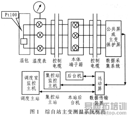 综自站主变测温系统是由本体温包、毛细管、温度表、温度变送器、通道电缆、远方温度测试仪、信号采集转换模块、信息传输装置(远动机)、通信装置、光缆、监控系统主机(变电站综自后台机、集控站集控主机、调度集控主机)等组成,如网1所示。该系统采用复合温度传感器技术的BWY(WTYK)-803、(TH)802AXMT型压力式温度指示控制器(简称:温控器),能同时输出Pt100铂电阻信号。针对实现变电站无人值守,大多数现场要求温度表具备O~5 V温度信号远程传输功能。远程测温的温度变送器安装在温度表内或保护控制屏后。而有的测温系统则将4~20 mA输出的温度变送器和24 V DC电源模块集成在一起安装于变压器端子箱。温度表上传的电阻信号经温度变送器,输出一个0~5 V的电压信号或4~20 mA电流信号,经信号采集转换模块采集后计算,通过远动机传输到后台机、集控站、各级调度处。从而实现R-U转换。