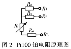 温控器采用复合传感器技术,在温包内嵌铂电阻,其原理接线如图2所示。引入第三根输入线R2可有效消除因引入线内阻而产生的固有误差,R1是铂电阻,R0 为户外至主控室(或保护室)电缆芯线内阻,其工作原理:由于引用第三根线R2形成等臂电桥,从而消除了R0的影响。因此,只有三根芯线内阻R0完全相等时才能消除内阻对测量结果的影响。