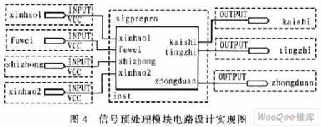 通过QuartusⅡ开发环境,文本编辑方式,用VHDL语言进行编程,生成图元,结合顶层原理图设计,实现信号预处理模块原理图,如图4所示。