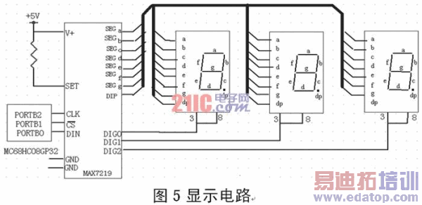 (三)LED显示电路。MAX7219就是一种高性能,低价格的多位LED显示驱动器,可同时驱动8位共阴极LED或64只独立的LED发光二极管,其内部具有14*8RAM数字和功能控制寄存器,可方便的对每位数字进行单独控制,刷新,不需重写整个显示器寄存器。如图5,通信方式采用串行数据方式,可与68HC08系列的任何一种微控制器方便的接口,广泛应用在条状图形显示器,7段数码管显示器,工业控制器显示模板,面板表与LED矩阵显示屏等众多场合。
