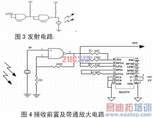 (一)发射电路。本系统采用方波调制的脉冲发射电路,即采用单片机的PORTA4口作为IO口,同时外接驱动芯片来提高其输出电流的驱动能力,保证40KHz的脉冲信号有一定的功率。单片机产生以5个40KHz为一组的脉冲群,加到压电晶片上能使晶片发出超声波,当信号为高电平时,发射传感器两端就加上了高电压,内部的压电晶片开始振动,此时接收传感器的两端可以检测到有40KHz信号;当信号为低电平时,发射传感器通过回路放电,此时接收传感器可以接收到回波信号。