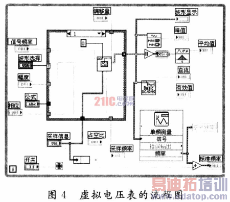 用一个while条件语句设计整个框图程序,当模拟电压开关为"1"时,虚拟电压表工作,条件语句中的程序开始运行;当模拟开关为"0"即关时,条件语句中的程序停止运行,虚拟电压表不工作。设计好的流程图如图4所示。
