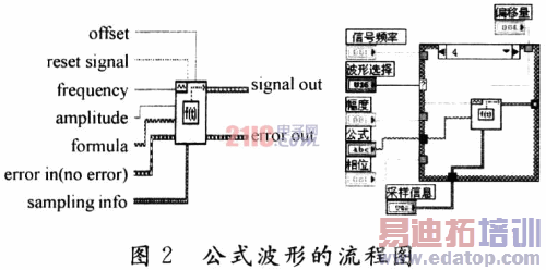 由于虚拟电压表主要用于演示,所以为了方便,可直接利用LabVIEW软件产生仿真信号。在该设计中,设置了正弦波、方波和三角波以及由公式确定的任意波形。在程序设计框图中,使用一个Case(选择)语句对四种波形进行选择。Case语句中,每一个数字(0,1,2,3,4)都代表一种波形,与前面板控件中5种状态相对应。至于Case语句的制作,只需将4个图标中的一个,例如正弦波发生程序,用Case框起来,然后在上面的空白处写上相应的数字,例如1;然后点击箭头,可以设置第二个图标,如果要添加一个Case的话,可以点击鼠标右键,直接添加,编辑相应的基本信号发生器VI中相应的节点即可。在添加公式波时,要把基本信号发生器VI换成公式波形VI,0代表默认状态,表示无任何波形输入。本文给出了Case结构的一个分支,公式波形的流程图如图2所示。该子Ⅵ可使用指定时间函数的公式字符串生成一个函数波形,它要求公式的自变量必须是t,它所支持的运算符和常用的函数详见参考文献。
