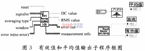 图3中,DC value为测量的直流分量;RMS为value测量有效值;reset用于重启过去记录的时间信号、平均测量的参数;averaging type是测量中的平均类型,在单个模块VI中,可依据输入记录长度自动设置平均时间;Window是在DC/RMS计算之前,用于记录时间的窗;erroe in是在该VI运行之前描述错误环境,默认值为no error。如果错误已经发生,该VI在errorout端返回错误代码,子VI在无错误时才正常运行。