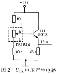 采用数字电位器DS1844产生UG1K、UG2P、UF电压,该器件内含4个独立、6位(64阶)线性变化、可编程的分压器,采用I2C接口。硬件上,单片机P89LPC932通过I2C接口2个引脚与其相连;软件上通过写入控制字控制电位器的增大、减小和设定。由于DSl844的负载能力有限,也需采用放大电路扩展其负载能力。图2为UG1K电压产生电路,VT4接成共集放大电路,该电路能够输出一个64阶变化的电压UG1K。同样,采用DS1844的另外2个分压器和相同的驱动电路输出64阶变化的UG2P、UF电压。