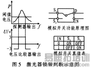 图5中设定阈值电压是判断系统用于否超出锁定范围。对比PD检测信号与阈值电压,当检测信号高于阈值电压时,表明系统未失锁,电压比较器输出正电压:当检测信号低于阈值电压时,认为激光器失锁,电压比较器输出负电压。电压比较器的输出信号输入到模拟开关,控制模拟开关的通断。