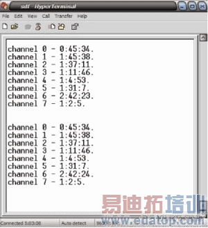 当电池?插入测试仪的任何一个通道时,该通道的定时器被初始化。只要任何一个通道的输入电压大于0.9V,则所有通道的定时器都通过Hypertermina显示更新,每3秒一次。当通道的输入电压降至0.9V阈值以下时,该通道的定时器值将停止增加。因此,一旦所有的电池电压都低于阈值,定时器值将停止显示。如果每个通道的电压都低于0.05V(即测试仪内没有电池时),则每个通道的定时器将被复位。定时器显示格式为:时:分:秒。