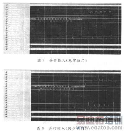 时序控制电路设计完毕后,需要对各部分进行功能仿真、逻辑综合以及综合后仿真,最后对整个系统进行综合、布局布线,完成时序仿真。对各模块编程并仿真通过后,将各模块加载到主函数top中,采用并行的寄存器配置方式,对卷帘和同步两种快门方式进行仿真,在Modelsim中的仿真结果如图7,图8所示。