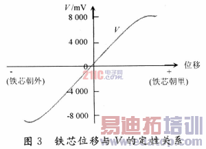 当原边供给一振荡电压时,由于电磁感应,两付边就分别产生感应电压V1和V2。若铁芯正处线圈的中心位置时,两付边对原边的互感量正好相等,同时两付边的交流电压分别经检测电路检波后,把所得两直流电压取其差值,则输出差动直流电压V为零。当铁芯往上位移时,上边的付边与原边的互感量增大,而下边的减小,即出现V1>V2,则差动直流输出电压V>O,反之亦然。LVDT两付边的感应电压V1,V2和差动直流输出电压V与铁芯在线圈中的位置的定性关系见图3,可见差动直流电压V与铁芯位移的大小在某一范围内是呈线性关系的。测量时把LVDT壳体夹固在参照物上,把和铁芯连接的测杆紧固在被测点上,当被测对象位移时就带动铁芯相对于线圈移动,从而线性地改变LVDT的输出电压。这样通过电测仪器测量LVDT输出电压的大小,即可测量出被测对象的位移量。