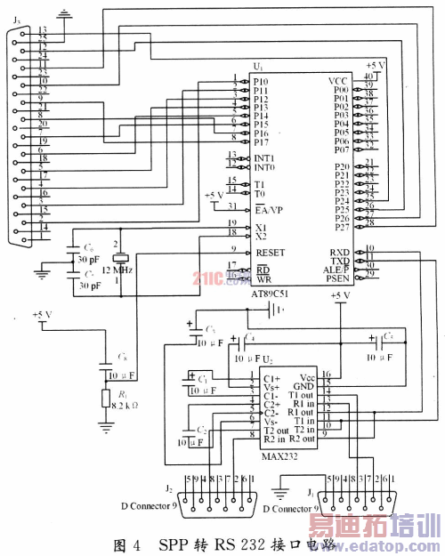图4为以AT89C51为核心的SPP转RS 232接口电路原理图。AT89C51是一种带4 KB闪速可编程只读存储器低功耗、低价格、高性能CMOS 8位单片机。单片机的P1端口与数字位移传感的输入端口相连,向传感器中的A/D送入操作状态,P2端口的高四位与传感器的输出端口相连,用于读取A/D转换的14位数据信息。