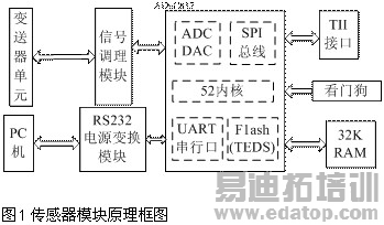 传感器的输出信号经调理模块放大调理,输入至ADuC812片内的多通道ADC,ADC对相应通道模数转换后,存储于RAM中,然后通过TII智能接口将数据读入NCAP。为了方便TEDS内容的升级与更新,系统采用异步串行口来下载电子数据表格至ADuC812的片内Flash。此外,异步串行口还可用来下载和调试用户程序,方便系统开发。