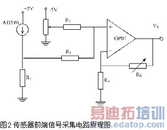 温度传感器采用AD公司的AD590芯片实现的,它是单片集成两端感温电流源。其电路原理图如图2所示,其中R1=5.1KΩ,R2=R3=10KΩ,R4=2KΩ,R5和R6分别选10KΩ的电位器。AD590受温度变化产生电流信号时,在电阻R1两端产生电势差,从而在运放输入端产生电压信号,由加法电路进行调节零点漂移;由运放OP07进行比例放大,放大倍数由电位器R6调节,使测试温度范围在0~65℃,输出电压相应为0~2.5V。