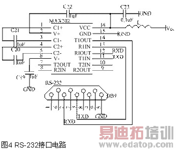 程序存储器阵列可以按两种模式之一来编程:一种是串行下载(在线编程)模式;另一种是并行编程模式。并行编程模式与常规的第三方提供的闪速或EEPROM器件编程器完全兼容,但应用起来较复杂,需要对ADuC812中支持并行编程所需的外部引脚进行配置。所以,在本模块的开发和调试过程中采用的是串行下载模式。作为工厂引导代码的一部分,ADuC812本身具有在线编程的程序,使经过标准UART串行接口实现串行代码下载变得容易,只需通过一个与地相连的1kΩ电阻将ADuC812的/PSEN引脚拉至低电平,那么上电时器件将自动进入串行下载模式。本系统使用图4的RS-232接口电路,从而实现上位机与ADuC812的串行接口通信。