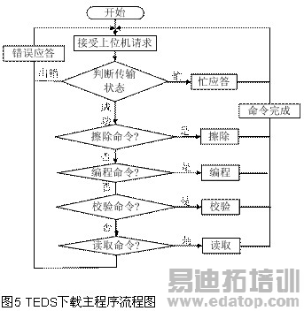 本系统的TEDS下载程序是RS232串行通讯程序,分为单片机程序和上位机程序两部分组成。这里研究单片机程序的开发。PC机和单片机之间要实现串行通信,除了要遵守RS232串行通讯协议外,还必须具有各自的通信应用软件。通信软件的设计思路是:PC机为主动方式,在通讯开始后由PC机向单片机发送请求,单片机返回应答信号,通讯正常后,单片机根据PC机发送来的命令,执行相应功能并应答。单片机流程图如图5。
