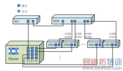 使用iTester网络测试仪进行XPON系统测试时,需将OLT接入网络测试仪的一个端口,将剩余ONU设备分别接入网络测试仪的其余端口。
