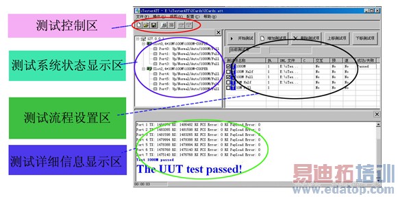同时,针对PON设备的测试,iTesterATT还提供了信而泰独创的自动化会聚测试方法, 可显著提高PON设备的测试效率,因此在PON产品测试领域得到了广泛的应用。iTesterATT软件界面分为测试系统控制区、测试系统状态显示区、测试流程设置区和测试详细信息显示区。如图5所示。