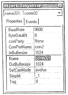 当执行ComPortOpen函数(即方法)时,用CreatFile()打开串行口,此时fdwShareMode,参数必须是零,打开独占访问的资源。FdwCreate参数必须是指定的OPEN_EXISTING标志,hTemplateFile参数必须是Nil,用GetCommState设置通信参数,用CreateEvent()创建事件对象,用AllocateHWnd()得到窗口数构柄;利用Delphi3.0创建多线工具建立一个监视线程的对象TmyCommWacth;在监视线程中用ResetEVent()设置事件句柄,用WaitForSingleObject()指定对象处于信号或超时状态时返回,用PostMessage()向指定窗发送消息; 窗函数收到消息后用ClearCommError()清除错误,用自定的过程 OnCommData(PChar(msg.LParam), msg.WParam )触发事件OnComm,当执行端口关闭函数comPortClose时 ,用CloseMyComThread撤消监视线程,用DeallocateHWnd()释放消息窗句柄,用 CloseHandle()关闭事件和串口;用RegisterComponents 对构件进行注册。考虑到篇幅源程序未提供读写缓冲数据程序,实际上接收数据可在OnComm事件中用ReadFile()读,其文件句柄为ComPortOpen返回的串口设备句柄hCommFile;写数据可编一过程或函数用WriteFile(),其文件句柄同读句柄,读写数据比较简单。图2为编译安装后构件在Object Inspector下所现示的属性及事件。