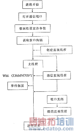 构件的设计思想是:可视属性中的数据位、效验位、停止位、触发事件方式用梅举类型定义,编程人员将方便地选择所需的值就行了,可视属性中波特率、串行口名、输入缓冲大小、输出缓冲大小由编程人员输入设定;触发事件方式有每收一字符触发和一队列收到后触发。在构件的创建过程中将可视属性赋缺省值,当程序运行构件的端口打开函数(ComPortOpen )时,将串口按构件可视属性设定值进行端口初始化及创建监视串口线程并返回端口句柄(hCommFile);监视线程的作用是,按触发事件方式监视串口,当串口有数据时就向窗函数发出自定义的WM_COMMNOTIFY消息,窗函数收到WM_COMMNOTIFY消息后触发OnComm事件;当执行端口关闭函数(comPortClose)时,该函数关闭端口并撤消监视线程。程序流程图为图1。
