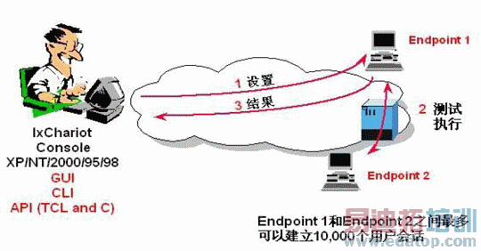 IxChariot 是控制平台, 可以在网络中的任何地方, 只要IP 可达, 和Performance Endpoint 之间能够联系上即可。 所要测试评估的就是Performance Endpoint 1 和 2 之间的端到端的性能。
