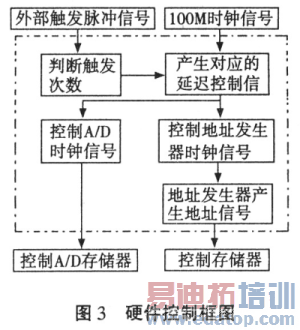 虚线框内的是硬件逻辑控制模块,该模块可以完成我们所设计的高速数据采集所需的A/D转换器和存储器的控制信号。