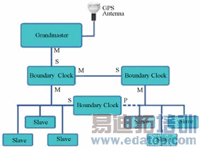 IEEE 1588将整个网络内的时钟分为两种,即普通时钟(Ordinary Clock,OC)和边界时钟(Boundary Clock,BC),只有一个PTP通信端口的时钟是普通时钟,有一个以上PTP通信端口的时钟是边界时钟,每个PTP端口提供独立的PTP通信。其中,边界时钟通常用在确定性较差的网络设备(如交换机和路由器)上。从通信关系上又可把时钟分为主时钟和从时钟,理论上任何时钟都能实现主时钟和从时钟的功能,但一个PTP通信子网内只能有一个主时钟。整个系统中的最优时钟为最高级时钟GMC(Grandmaster Clock),有着最好的稳定性、精确性、确定性等。根据各节点上时钟的精度和级别以及UTC(通用协调时间)的可追溯性等特性,由最佳主时钟算法(Best Master Clock)来自动选择各子网内的主时钟;在只有一个子网的系统中,主时钟就是最高级时钟GMC。每个系统只有一个GMC,且每个子网内只有一个主时钟,从时钟与主时钟保持同步。图1所示的是一个典型的主时钟、从时钟关系示意。