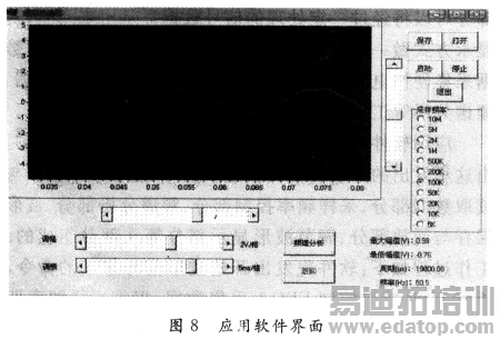 应用软件是整个系统的控制中心,所有的命令都是由这里发出的。主要由面板显示部分、触发采集数据与读取数据部分、采样频率控制部分、频谱分析部分、波形保存与回放部分、调节波形显示部分等几部分组成的。工作过程如下:软件先发出开始波形信号采集的命令,通过USB接口控制FPGA采集数据,根据采样频率即可大概估计FPGA采集500个点所需要的时间,经过适当的延时之后就控制从FPGA存储器读取采集的数据,然后根据采样频率和信号的放大倍数对数据进行适当的处理,最后就在面板上显示出来。定时地重复上面的过程就能够定时地更新显示的波形,从而实时显示信号的波形。