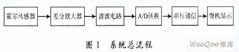 系统可以分为3个部分。第一部分是信号源,由霍尔传感器产生电压信号,信号通过差分放大,滤波得到较清晰的信号;第二部分是信号经过A/D转换送入单片机进行处理,再通过串行通信送入PC机处理得到结果;第三部分是数据的显示,这部分是通过VB的绘图程序来完成,显示结果以v-x关系图来显示。系统总流程如图1所示。