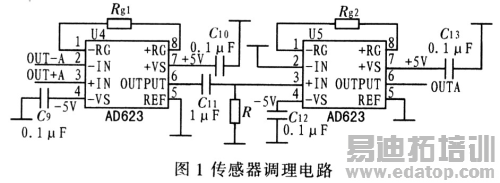 第2级REF接1.5 V参考电压,调节Rg2使输出信号在满量程时的输出范围在0~3 V之内,以便DSP的A/D转换器采集数据,传感器的调理电路如图1所示。
