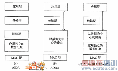 在介绍AIDA的工作流程之前,比较一下数据融合不同方法的几种结构设计。传统的ADDA存在网络层和应用层间的跨层设计,而AIDA是增加了独立的界于MAC层和网络层之间数据融合协议层。前面提到过分层和跨层数据融合各有自己的利弊。当然,也可以将AIDA和ADDA综合起来应用,如图4所示。AIDA的提出就是为了适应网络负载的变化,可以独立于其他协议层进行数据融合,能够保证不降低信息的完整性和不降低网络端到端延迟的前提下,减轻MAC层的拥塞冲突,降低能量的消耗。